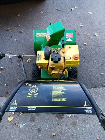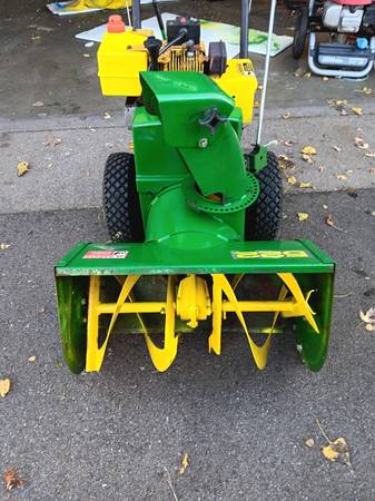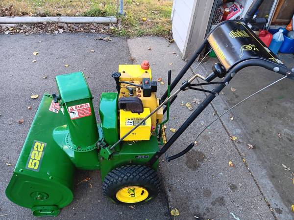 John Deere 522 snow Blower. starts with pull cord {1 or 2 pulls} or electric starter. runs good new oil, new spark plug ready to use. snowblower
