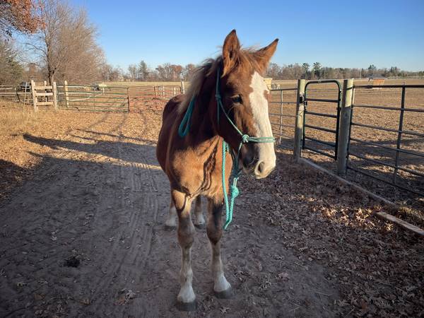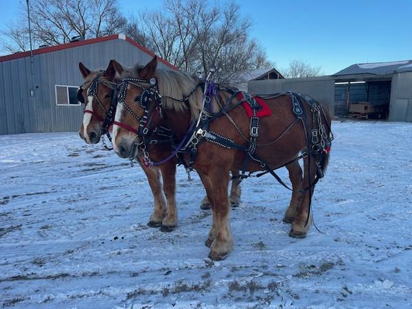 Bonnie is about 21 years old, broke to all equipment, and traffic safe. I worked her several times last winter in busy areas, and she handled it like a pro. This spring she spread some manure, then spent over five months in the pasture. When harnessed again, she stood calmly and drove off as if she’d been worked all week. She’s the kind of horse that stays broke and is as safe as they come. She’s very thin right now—Willow wasn’t weaned as early as I’d hoped—but with a proper diet, she’ll fill out. The harnessed photos are from last winter, when she was still pregnant. Bonnie is the left-hand horse.