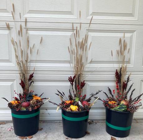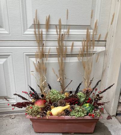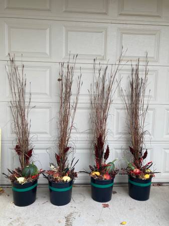 Fresh made autumn decor patio porch pots. Beautiful outdoor displays. Supply is always in flux as I make them and pots sell. I can send all current stock if desired before arrival to ensure I save the one(s) you desire. I do put plastic containers inside the pots to reduce the weight so they are not super heavy. $10 each. The porch pots are roughly 3’-3.5’ tall from the bottom of the pot to the top of the arrangement (grass tip). I have tall ones too at around 4.5-5’. The grass tips are flexible and bend for transport.