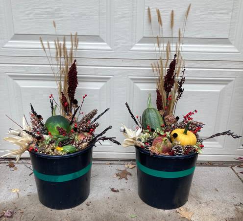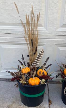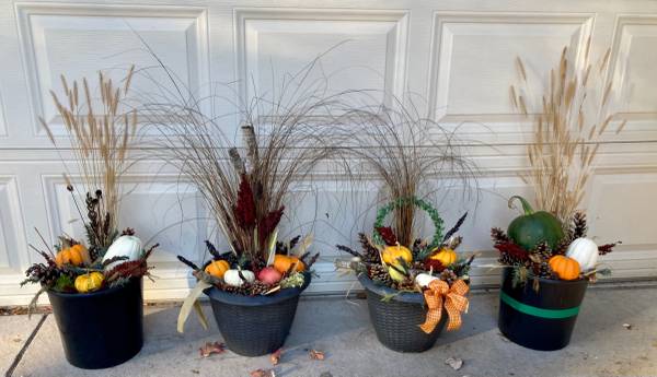 Fun mixes with various items such as festive bows, ornamental blue mini corn cobs, gourds, mini pumpkins, artificial decor, sumac, ornamental grasses, pinecones, etc. Pickup is at my house near the Village Inn in Wyoming Mn right off interstate 35. I would gladly accept any pots of any size and condition that you no longer use as I also do pots for other seasons and grow seedlings. Thank you