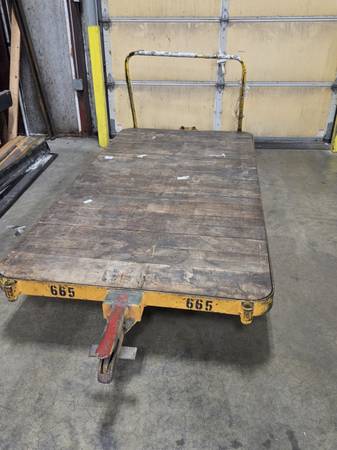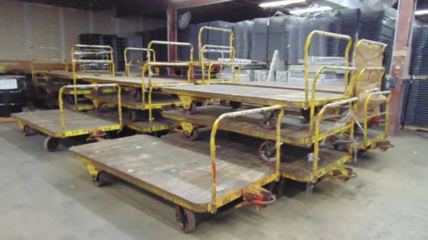 USED PLATFORM TOW CARTS, Nutting Steel Carts 🟢$200.00 each Manufacturer: Nutting Dimensions: Length: 8′ | Width: 4′ | Height: 42″ Deck Height: 15″ Wheel Diameter: 10″ Model Number: 252-001-483 Load...