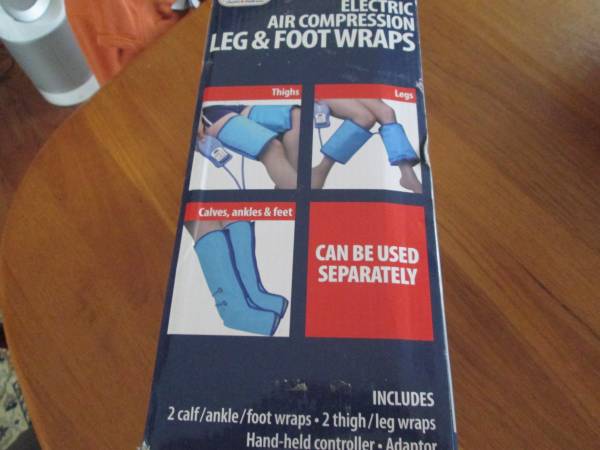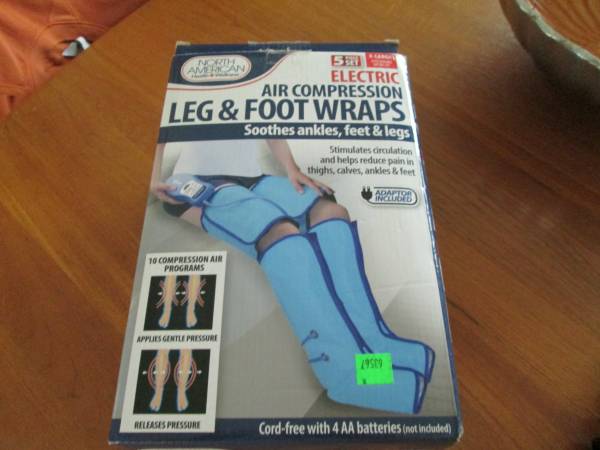 Never used, in box Electric air compression leg and foot wraps. Soothes ankles, feet and legs. Stimulated circulation and helps reduce pain in thighs, calves, ankles and feet. Cord free with 4AA batteries, remote controller. Retail 89.99 Cash Only