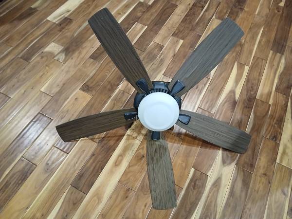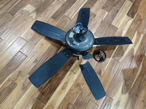 Hampton Bay 52" ceiling fan and light. Both fan and light work great. In good shape except one blade us broke (can replace individually if desired). Blades are reversible. Light can be dimed....