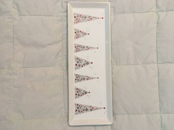 Rectangular serving/appetizer/bread dishes, candle trays etc. Prices as marked below. St. Nicholas Square white with silver snowflakes in gift box. 12.75" x 5" $10 Food Network white with silver and...