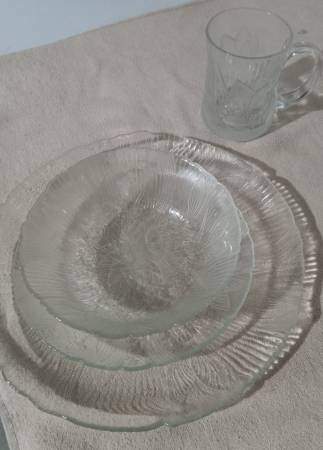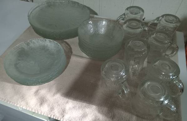 Glass dish set for 8, floral pattern. 8 large dinner plates 8 smaller salad/dessert plates 8 bowls 8 cups $40 cash.
