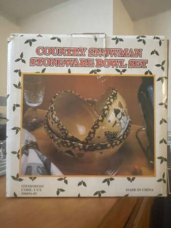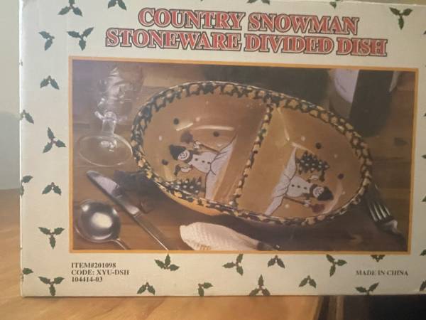 Stoneware Snowman serving platter, divided plate and bowls. Nice set, used twice. No chips or cracks. Great addition to any Christmas gathering/meal