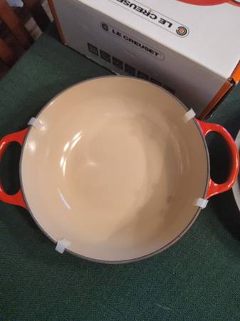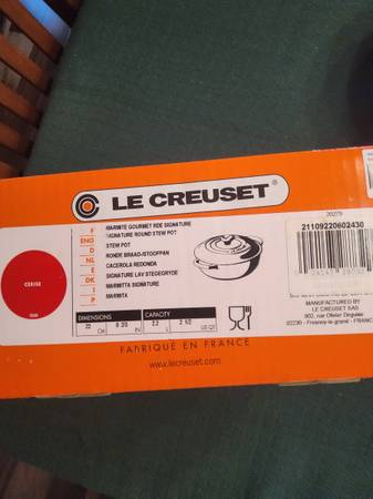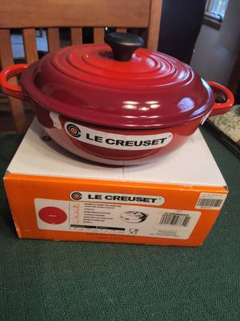 New in Box. Le creuset SIGNATURE 2.5 quart cast iron stew pot. Beautiful color of Cassis aka cherry red. Has upgraded phenolic knob capable of withstanding higher heat. First quality. Flawless. Please- no offers. Smoke free home. Thank you.