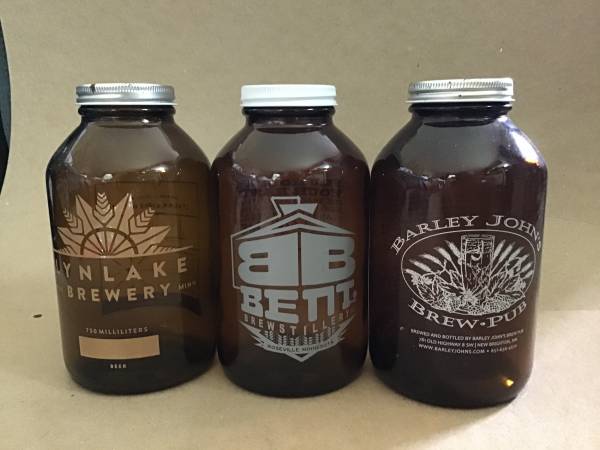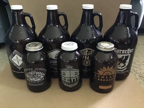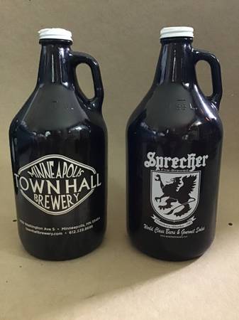 Lot of 7 different beer growlers. Includes 4 big growlers and 3 small ones. The large growlers are from Minneapolis Town Hall Brewery, Sprecher, Voyageur, and Central Waters Brewery. The small ones are from Lynlake, Bent, and Barley John's Brewery. All 7 for $25.