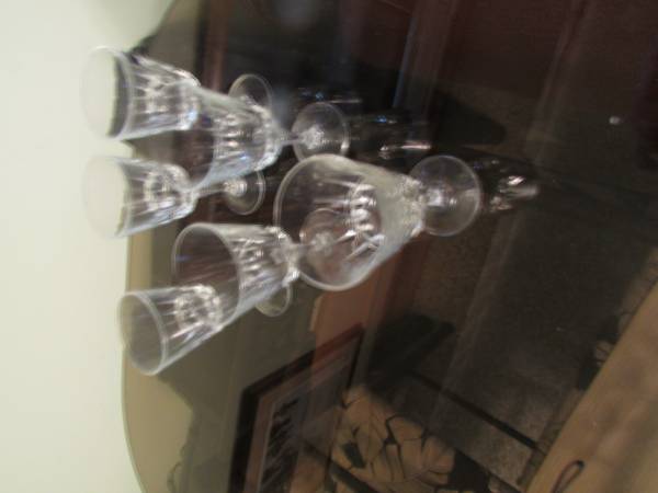Six (6) never used cut glass crystal Claret wine glasses that have one blue sticker that indicates they are "Lady Victoria, fine crystal stemware imported from France". They measure 6 1/8 inches tall and each glass is 2 7/8 inch diameter at the top. I found several listings on Etsy that stated that they were from the 70's and 80's and were listed as $50.00 for 8, $26.00 for 5 and $28.55 for 4 in 3 separate listings. The label on the box says they are D'Arques wine glasses. If you only want one or two the cost will be $5 per glass or you can have all 6 for $21.