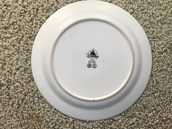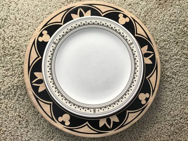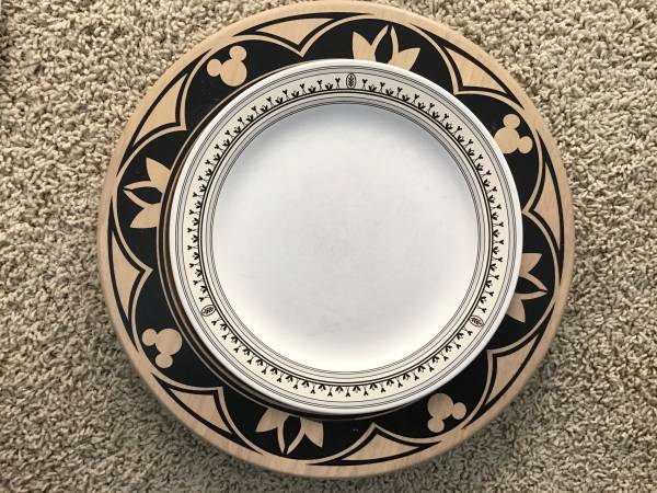 Lot includes 4 Disney wooden chargers and 6 plates. The plates look like they were used heavily and have wear. Also, one is chipped on the back along the edge.