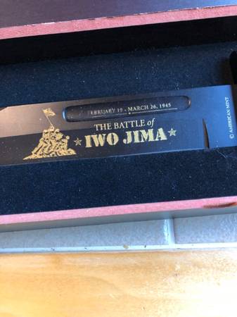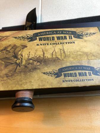 america at war WW II Knife collection american mint 12 " long in wooden display box one side battle of Iwo Jima with flag being raised one side america at war World War II cardboard cover for...