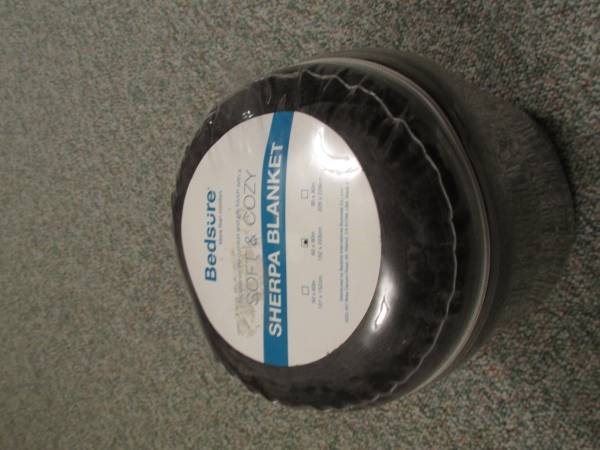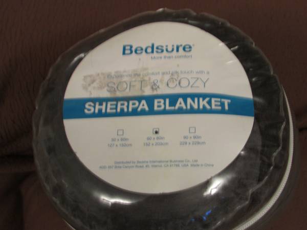 Never used in the original plastic sleeve, Bedsure sherpa blanket that is 60 by 80 inches that is distributed by Bedshe International. These usually list for $33 and routinely sell for $24. Purchased for a friend in a nursing home who was always "cold" but like times endless movement, she passed away before we could get it to her. Just right for a twin bed, snuggling on the couch or in your favorite chair.