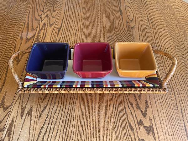 Pampered Chef Simple Additions 4pc Set Striped Rectangle Tray and 3 Solid Bowls. $20.00