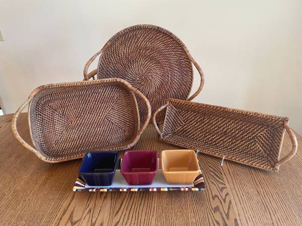 Pampered Chef woven basket/serving trays and Simple Additions stoneware serving pieces all in very good to excellent condition. Used for display in a smoke and pet free home. The baskets were not used with food items.