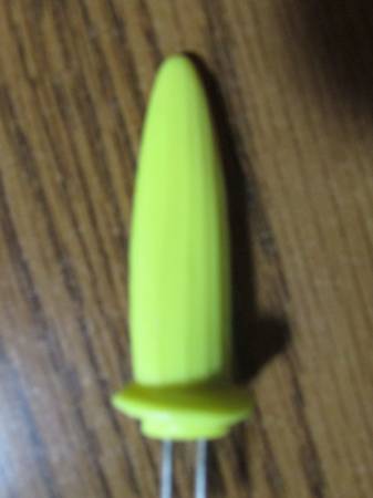Six quaint yellow plastic with 2 stainless steel tines to safely hold hot corn cobs to keep your fingers away from the hot cobs and the absolutely necessary and required butter. They are about 3 1/4 inches long and are like new. I have seen these advertised with prices ranging from $.50 to $1.25 each. A perfect gift for the sweet corn aficionado.