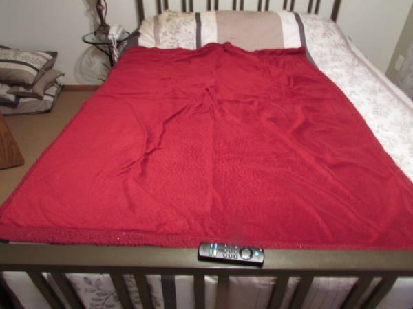 Burgundy lap throw that measures 47 inches by 57 inches (odd size) that is smooth on one side and fleece like on the other. There is some lint on the fleece side that can be picked off but I am too lazy to spend the time to do it. The photo shows it on a queen size bed for comparison. Probably sized for a person sitting in a favorite chair while watching TV or reading.