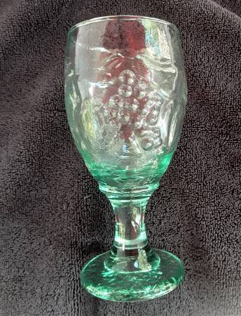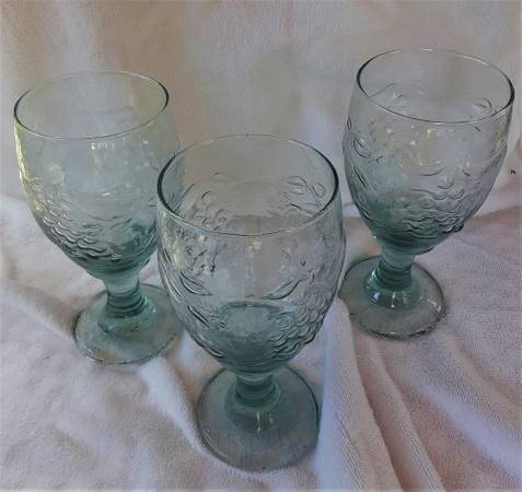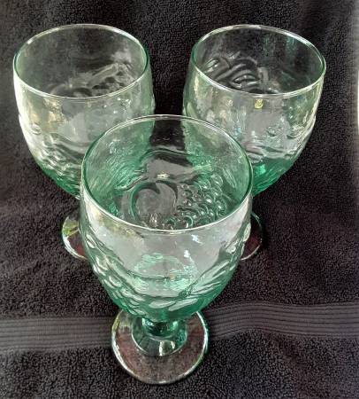 Glassware, set of 3, 12 oz, green embossed with grape cluster/leaf pattern, set of 3. 7" tall, 3.5" diameter. In original boxes. Cash only with pick up in Mounds View or Roseville, MN