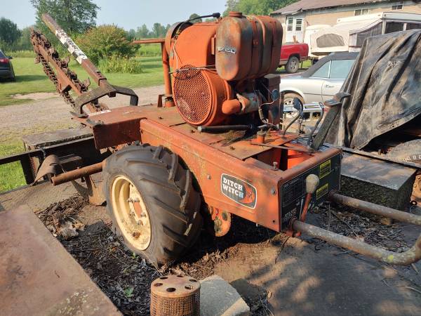 Ditch Witch 1500 trencher for sale trenches to 4' deep Hasn't been run in quite awhile has a stuck exhaust valve and needs tires $800 Comes with the trailer its sitting on. Thank you