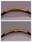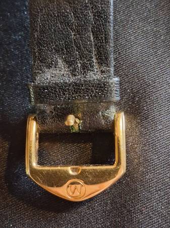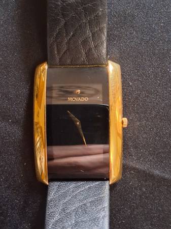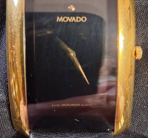 Dial: black with gold and embossed dauphine hands, also in gold, Movado logo at 12