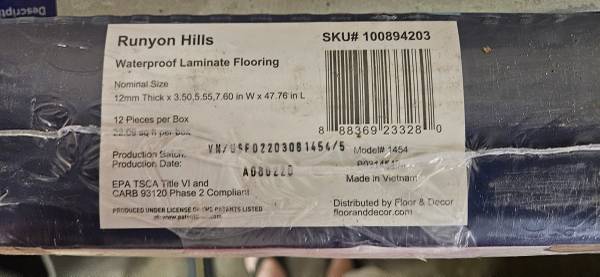 I have one box of AquaGard Performance Waterproof Laminate, Runyon Hills color, left over from our house project. It is about 20 Sq. Ft and cost $60.