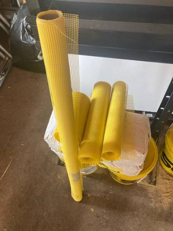 Two full unopened buckets of top coat, two bags of base coat, nearly full 9.5” roll of detail mesh, 48” wide mesh remnant, ~16”wide mesh remnants.