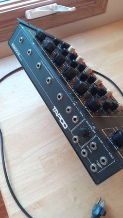 Tapco mixer 6 channel with xlr and 1/4" inputs,2 channel 1/4" output,and reverb, everything works,a couple potentiometers need to be cleaned,scratchy when you turn them.