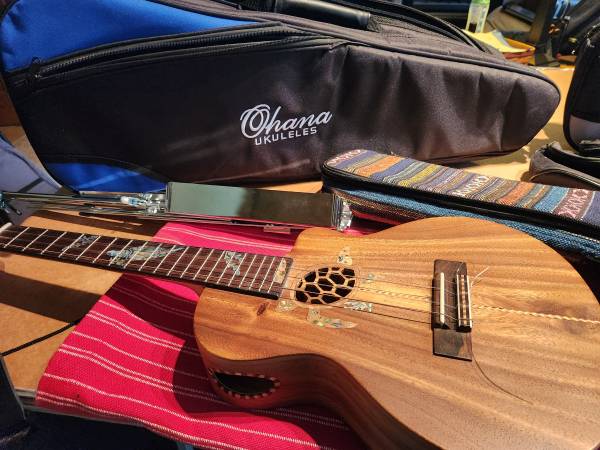 Uke Ukuleles Tenor or smaller Music stands All Like new or New Double Ukulele Bag Case - can use for 2 ukes, music, music stand and 1 uke. Blue/black $35 cash The Uke is Not for Sale- Sorry. Black...