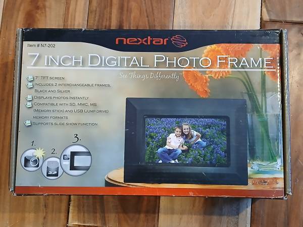 Nextar 7" digital photo frame. Brand new in box. Includes 2 different frame options.