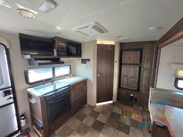 The u-dinette is on a slide. Along the rear wall you will find a pantry and a refrigerator. One side of the trailer offers a double kitchen sink, microwave, and three burner range. Above the range find an entertainment center.