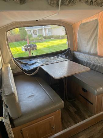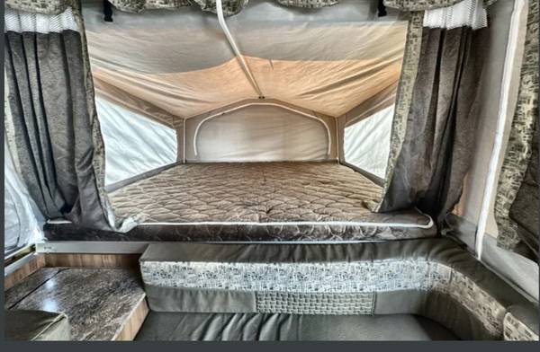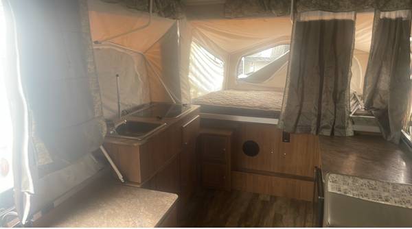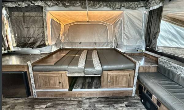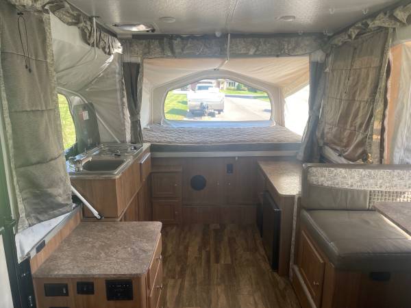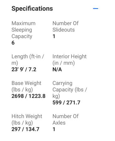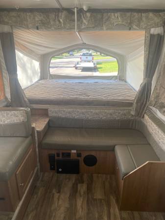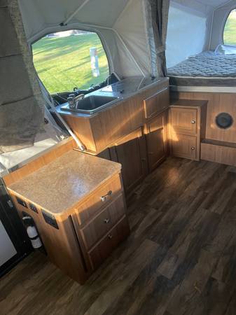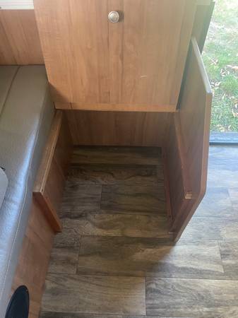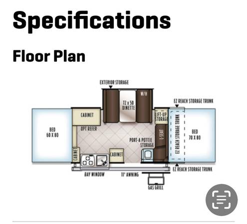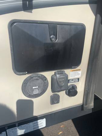 Great floor plan with a slide out and kitchen bump. 12v or 120v fridge. Sleeps 6, 3 burner gas cooktop, dual 20 pound propane tanks. Good battery and tires including spare. Comes with a factory WiFi booster and power lift system. TONS of storage including a “trunk” in the front with a full width slide out drawer compartment and a power roof fan. Factory speakers in and out and aluminum rims!