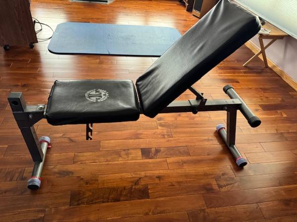Up for sale is an excellent condition used weight training bench that has multiple positions that include flat bench for bench press and other exercises, back up to accommodate seated position, and another position for seated arm press. Similar that have adjustable settings are sold online for $250 to $300 and they don't have the arm press position.