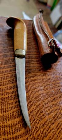 The handle is often made of reinforced birch wood, and the knife comes with a fine tooled leather sheath.