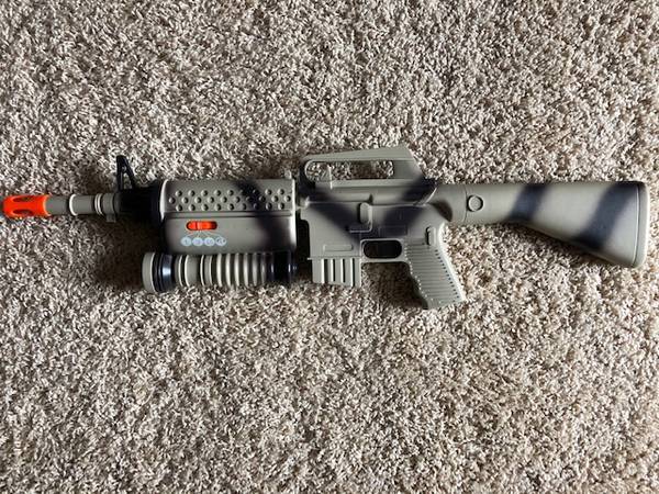 - Battery operated gun that you can choose from four different shot sounds when you pull the trigger