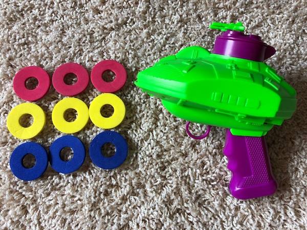 - Battery operated foam disk launcher with 9 soft foam disks