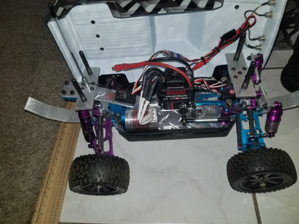 Fully moded / heavily upgraded billet wltoys truck , 3 sets of different kv 540 brushless motors , 120amp brushless hobbywing esc , 25kg steering servo , led headlights , radio / receiver , 3 sets of tires , hobbywing program card