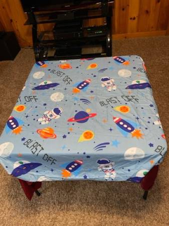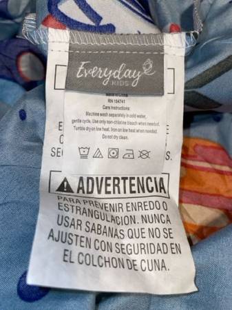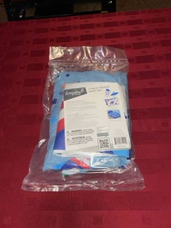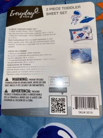 Never used (bag opened) Everyday Kids (100% Polyester) Toddler Fitted Crib Sheet/2-sided standard pillowcase. Fits Crib/Toddler mattress (28”x52”) and (30”x20”) standard pillow. Lisa from Chisago City.