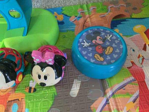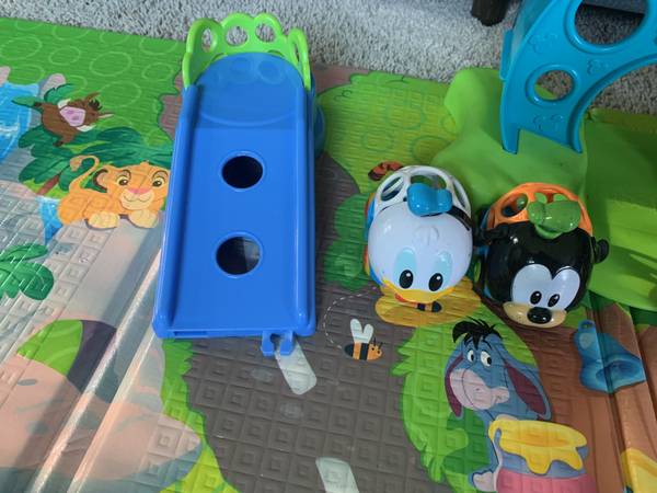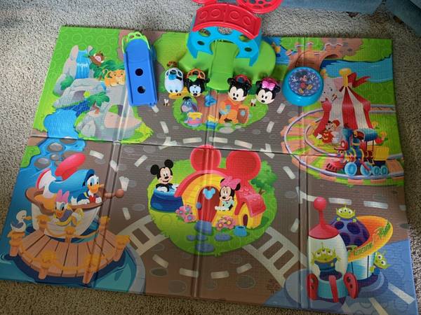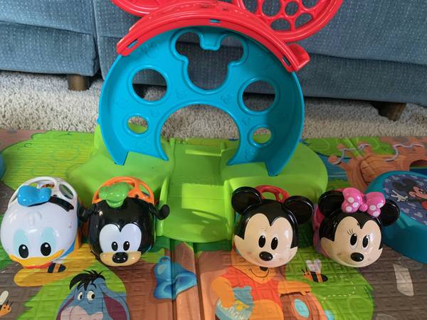 Includes oball cars of Mickey Mouse, Minnie Mouse, Donald Duck, and Goofy. Also, includes some accessories and a playmat that is almost 36"x48" The mat is made of foam.