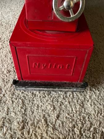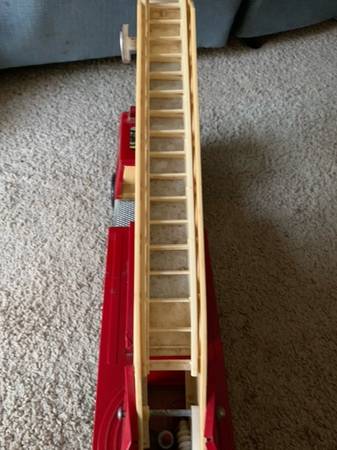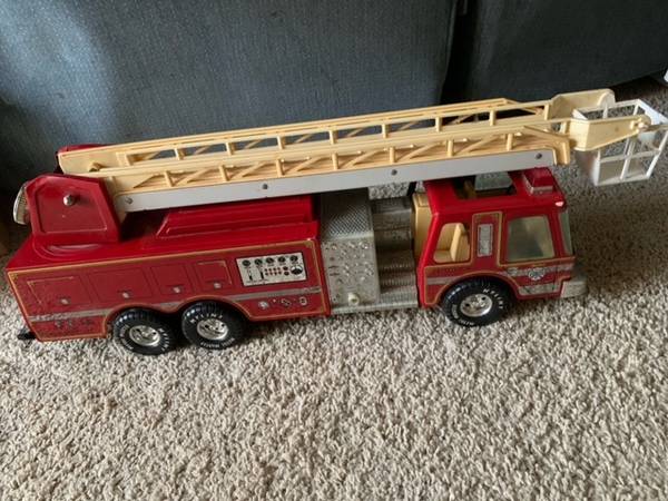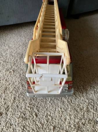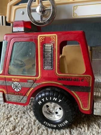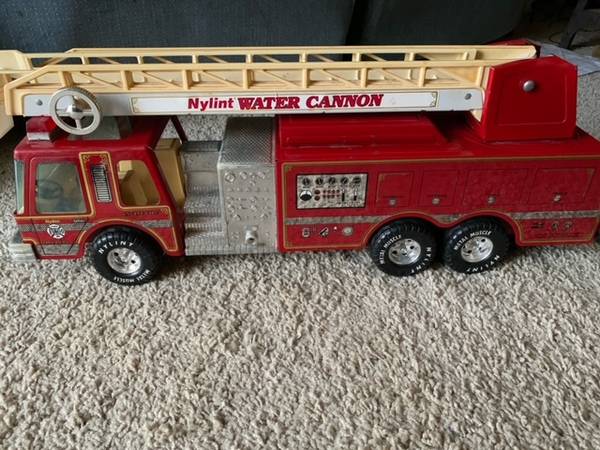 Nylnf Water Cannon Metal Fire Truck. Is a little dirty and has a few spots where paint is gone. The dirtiest parts are inside the cab and the ladder. Some of the bars on the basket are broke. Also, the ladder goes up and down with the crank but does not extend with the crank. About 23 inches long.