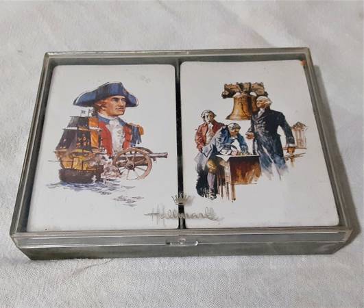 Hallmark Bridge Playing Cards. Vintage 1970s, "Floresence" Colonial American theme. , plastic coated. Complete sets includes jokers. in plastic protective carrying storage case. Cash or Venmo w/pick up Mounds View or Roseville, MN. Shipping option available by request