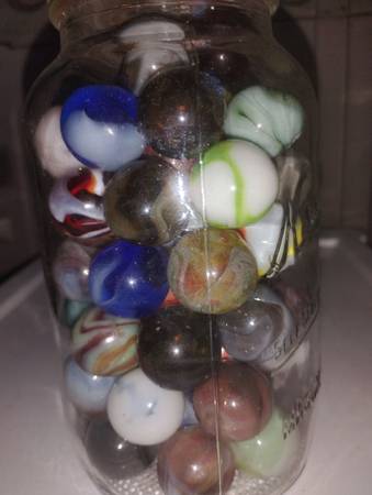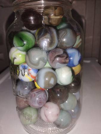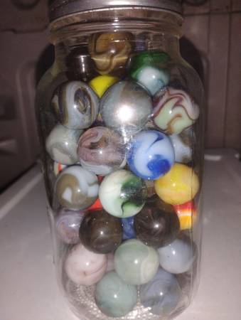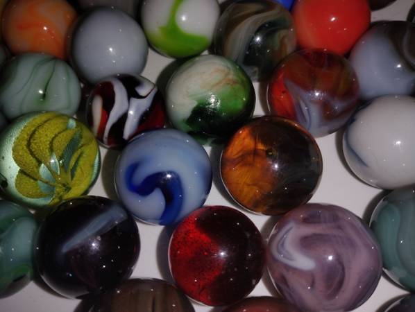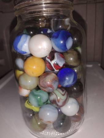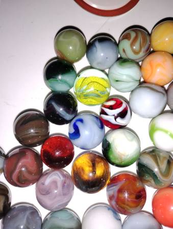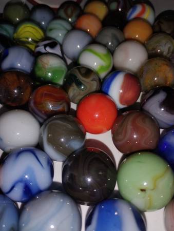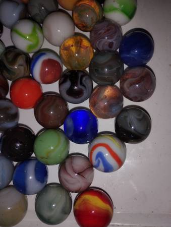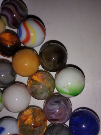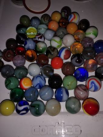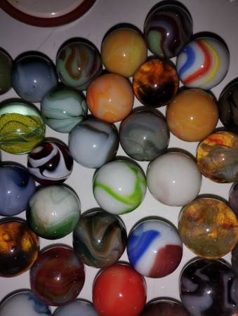 Vintage marbles to sell as a group of 65 shooter size, there condition ranges from mint wet to slightly played with, some small pecks or flea bites, some cold rolls as well, over all great marbles...