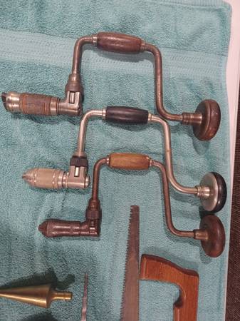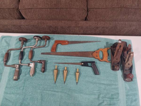 Selling as a lot only. 2 planes, 3 saws, 3 plumb bobs, 3 brace bit hand drills. Cash only and pick up only in Cambridge, no exceptions.