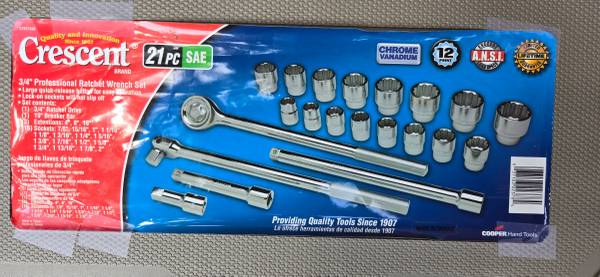 Excellent next to new condition 21-piece SAE, 12 Pt socket wrench set. Socket sizes: 7/8, 15/16, 1”, 1-1/16, 1-1/8, 1-3/16, 1-1/4, 1-5/16, 1-3/8, 1-7/16, 1-1/2, 1-5/8, 1-3/4, 1-13/16, 1-7/8, 2”. Includes 3/4 x 100mm EXT, 3/4 x 200mm EXT, 3/4 - 16” EXT, 3/4-19” handle, 3/4" rachet. Asking $150. CALLS ONLY - texts and emails will not be responded to.