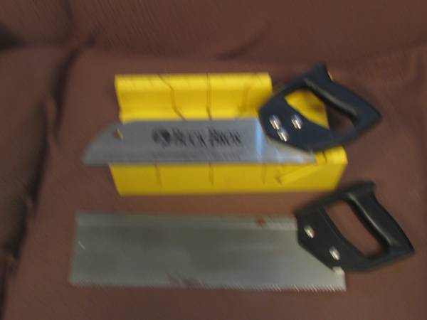 Used but in very good condition plastic ruled miter box that looks identical to model 120PMB12 marketed by Buck Bros. with a 14 inch 12 teeth per inch back saw and a Buck Bros. Professional saw designed for thinner woods. The thin wood saw is 12 teeth per inch and the blade is just under 11 inches long. The saw handles are plastic offset to keep your hand up and out of the area of the saw blade. The thin wood blade has a curved front end and the curve is toothed as well. There is some minor rust and stains from use but the saws are still very sharp and straight. I have found a back saw and box used on ebay for $19.95 and a new one for $32.99. Neither of the postings has the second saw included. WalMart has the box alone listed for $10.96 new and Home Depot has it listed for $13.99.