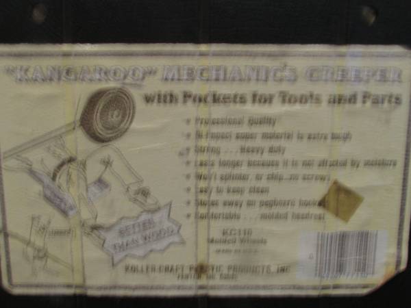 Used molded plastic mechanics creeper from Koller Craft Plastic Products, model KC110. This creeper has a space for your body that has a small head/neck pad, two 3 x 11 bins to store tools and small parts and measures 36 inches long by 13 inches wide and flares out to 20 inches wide at the storage bin area. The only metal parts are the swivel rods and bearings where the four 3 inch diameter offset plastic wheels attach. I found a recent sale on Ebay that listed it as vintage and it sold for $67.45 plus shipping and another current listing is for $74.75 with free shipping. A million years ago I used it to get underneath my work truck for maintenance and to hide from my honey. I am just too old to use it anymore and if she found me, I'm not sure what might happen anyway.