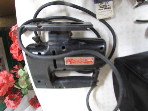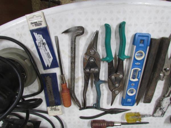 New Master Force 12 inch tool bag that you can have for $9, a Stanley stud sensor that you can have for $11, a vintage carpenters nippers that you can have for $19, 2 Wiss aircraft cutters that you can have for $10, 1 Porter Cable orbital palm sander that you can have for $13, a mini pry bar/nail puller that you can have for $6, a Craftsman Saber saw with 2 packs of new wood blades that you can have for $15, a 6 inch Heeb Company pliers that you can have for $6, a 5 inch needle nose pliers that you can have for $5, 2 each straight and phillips screwdrivers that you can have for $6, a 10 inch magnetic base torpedo level that you can have for $5, 1 wood and 1 metal 12 inch rulers that you can have for $5, a foam sanding block that you can have for $2, 2 10 inch long cold chisels that you can have for $6, and a mini splitting mall that you can have for $5, or you can have everything for $84. Not a complete tool set, but a decent mixed bag to use around the house.