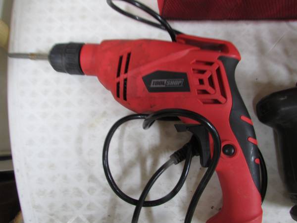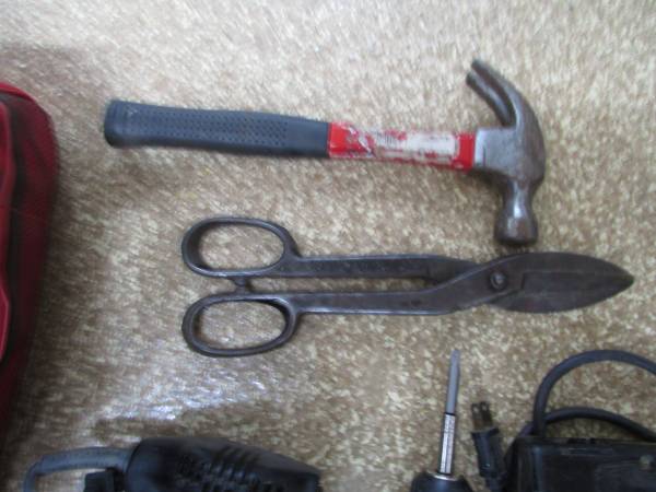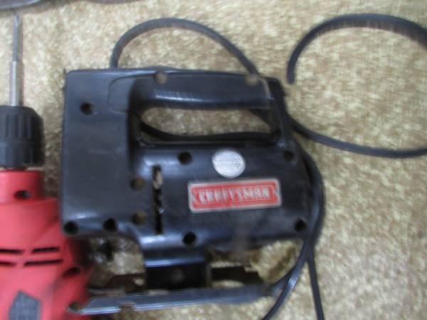 Combo tool setup consisting of a Skil 1/4 sheet pad sander model 7275, a 1960's vintage Craftsman 1/2 inch stroke saber saw model 315-17170, a Tool Shop variable speed drill, a 16 ounce fiberglass handle claw hammer, a Challenger 11 inch long tin snips, and 2 screw driver bits that fit in the drill all in a canvas Tool Shop bag. All the tools have been tested and work very well. If you are interested but do not want all the components the individual tools are: Skil sander $11, Craftsman saber saw $15, Tool Shop variable speed drill $16, the claw hammer $4, the tin snips $5, and the Tool Shop canvas bag $8. If you want to make an offer for any combination of some of the items, please identify which ones with your offer.