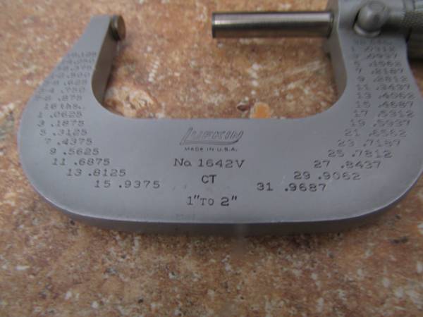 General model 102 micrometer that measures from 0 to 1 inch. A leftover from my working days and has just been sitting around for a while. It has a small amount of surface rust/staining but works as intended and will be costing about 10% of what new ones would cost. The 0 to 2 inch micrometer is Mitutoyo model 104-165 made in Japan that sells new for $225, and the third is a 1 to 2 inch made by Lufkin in USA, model 1642V, and usually sells for $48. The $47 price is for all three but if you only want one or two please indicate which ones with your offer.