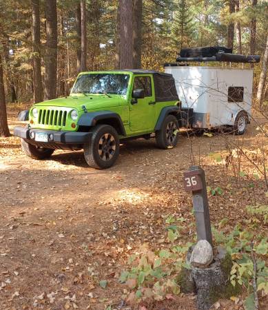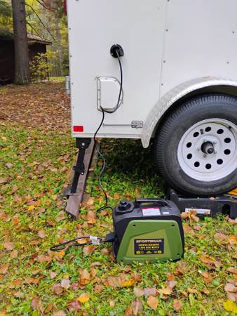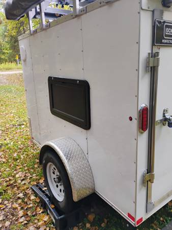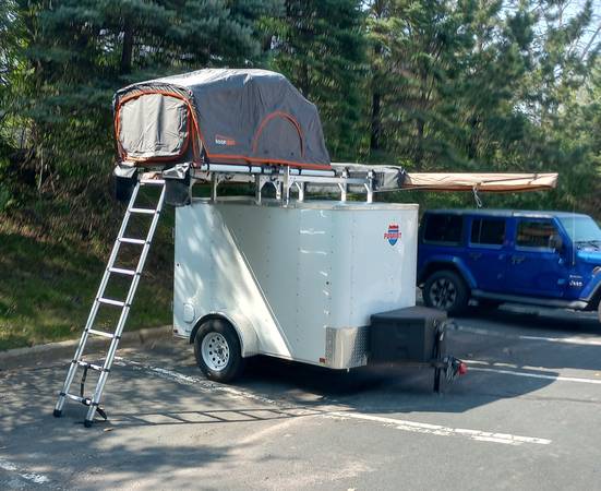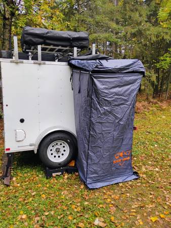 Interstate custom camping trailer. This trailer comes complete with rooftop tent, 270 degree batwing awning and exterior storage and exterior table. The roof rack comes complete with a kayak mount. There is also a pressurized solar shower and shower enclosure. The interior includes microwave, cooler and top and bottom slide out platforms. There are also shelves and an e-track storage system. The trailer has 12 volt electric input plus comes with a 1000 watt generator. The trailer is 5x8 and is one year old. The price will be good for one week. It goes into storage the 8th. In the spring the price goes up.
