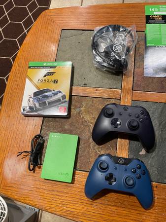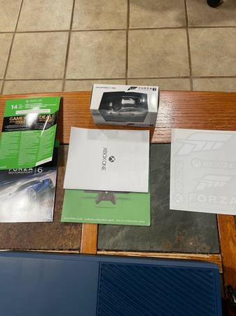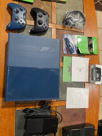 Complete Forza edition XBox One-comes with everything that it was shipped with. Box is in great condition, decal sheet is intact, GT3 car is like new in box. Unique engine revving on power on and off. Only thing that is not in great condition is the controller-rubber top hats are coming off, and rubber on back is as well (see pics), and right bumper sticks sometimes. Included in sale is an extra controller (Fortnite purple one), 2 TB Seagate XBox branded external drive (sells for $80-150 on its own) and rechargeable batteries and charging dock. Codes are used for the game and pass, but can pick up Forza 6 cheap. Included is Forza 7 as well. Factory reset already done and works as it should. Great deal for collectors or anyone who wants a complete system. Firm on price, thanks!