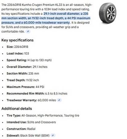 235/60R18 Kumho Crugen Premium Tires Set of 4